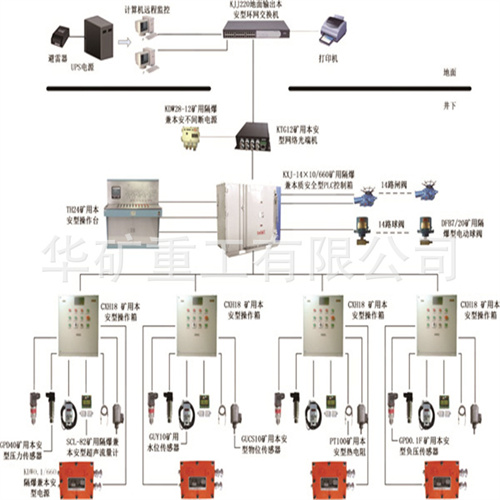 KJ416礦用水泵監(jiān)控系統(tǒng)主要由KXJ14×10/660隔爆兼本安型PLC控制箱、TH24礦用本安型操作臺、CXH18礦用本安型操作箱、監(jiān)控計(jì)算機(jī)及軟件、打印機(jī)、不間斷電源、多協(xié)議網(wǎng)關(guān)、多種傳感器及傳輸設(shè)備組成。