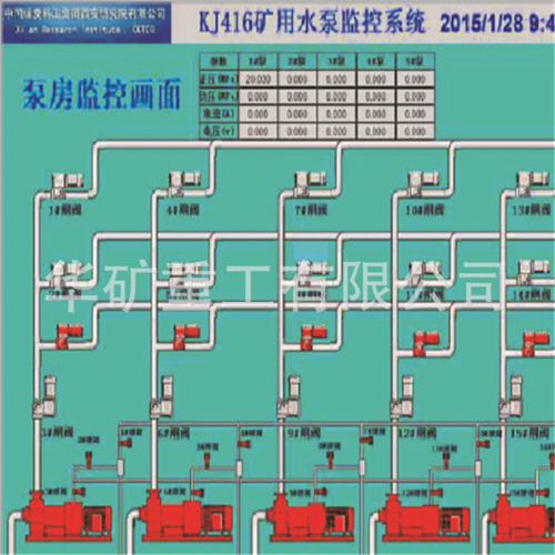 KJ416礦用水泵監(jiān)控系統(tǒng)是一套可對礦井水泵抽排水進(jìn)行集中監(jiān)控并能實(shí)現(xiàn)遠(yuǎn)程實(shí)時監(jiān)控的現(xiàn)代化控制系統(tǒng),該系統(tǒng)解決了現(xiàn)有礦井排水系統(tǒng)開泵程序繁瑣,發(fā)生透水事故時無人開啟備用水泵,系統(tǒng)故障以及排水效率低下等問題。本系統(tǒng)通過各種先進(jìn)可靠的傳感器、保護(hù)器、電動閘(球)閥、監(jiān)控電視等監(jiān)測煤礦井下排水系統(tǒng)各設(shè)備的工作狀態(tài),實(shí)現(xiàn)井下水位、水壓、水泵排水系統(tǒng)的自動監(jiān)控,及時發(fā)現(xiàn)系統(tǒng)存在的隱患與故障點(diǎn)。此外,將監(jiān)測到的數(shù)據(jù)實(shí)時通過光纖上傳至地面上位系統(tǒng)可方便實(shí)現(xiàn)井下泵房遠(yuǎn)程控制。該系統(tǒng)與KJ117礦井水文監(jiān)測系統(tǒng)的聯(lián)動,可以實(shí)時監(jiān)控礦井上下水文觀測孔水壓、水溫、流量以及采空區(qū)水位,排水明渠等水文參數(shù),通過多種傳感器的實(shí)時監(jiān)測可實(shí)現(xiàn)對煤礦透水事故的預(yù)警,事故通過井下光纜將數(shù)據(jù)傳輸至生產(chǎn)調(diào)度中心監(jiān)控平臺,系統(tǒng)預(yù)留井下通訊接口,并以指揮井下人員在發(fā)生透水事故時的緊急撤離,為及時啟動礦井水災(zāi)應(yīng)急救援和最大限度地保證煤礦安全生產(chǎn)提供可靠技術(shù)手段。
