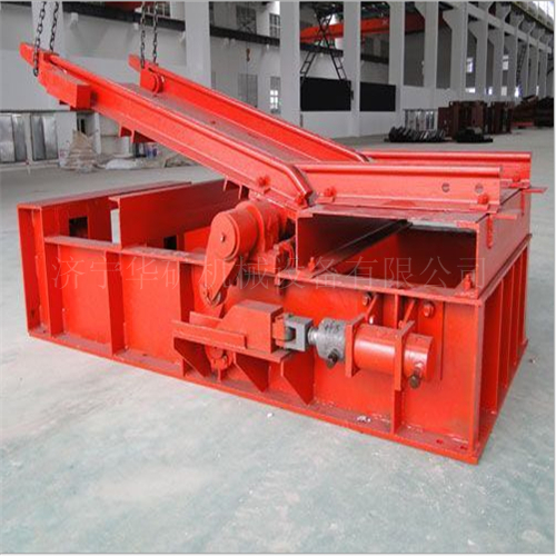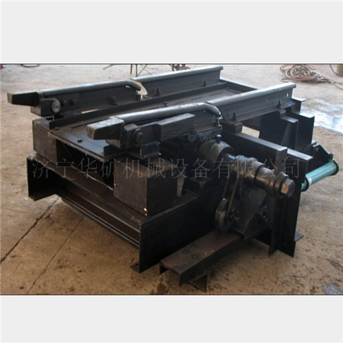 搖尖在搖臂前端,工作時與罐內(nèi)導(dǎo)軌襯搭接,搖尖鉸接在搖臂上,可以自由轉(zhuǎn)動一定的角度,搖尖的尾部設(shè)有配重,使其前部經(jīng)常處于抬起狀態(tài)。由于事故搖臺放下后,罐籠通過時,搖尖頭部被撞向下旋轉(zhuǎn),而允許罐籠安全通過。搖尖和導(dǎo)軌襯的結(jié)構(gòu)保證了搖臺與罐籠搭接時,側(cè)向能可靠的定位,從而使罐內(nèi)外軌道不會錯位,避免發(fā)生礦車掉道事故。搖臺抬起時,驅(qū)動輪處于自鎖狀態(tài),能保證搖臂不會意外落下,安全可靠。搖臂為箱型結(jié)構(gòu),強(qiáng)度大,不變形,適合各種大型設(shè)備運(yùn)輸。